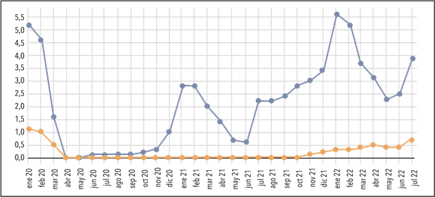 Si bien la caída de la economía fue bastante generalizada, los sectores más afectados de la cadena productiva fueron aquellos ligados al turismo (hoteles y restaurantes, actividades artísticas, culturales, deportivas y de esparcimiento), las cuales sufrieron directamente las medidas del ASPO (CEPAL 2022). La actividad tuvo un derrumbe sin precedentes: el turismo emisivo (internacional) cayó un 93 % con respecto a julio de 2019, y el turismo receptivo (internacional) un 99 % en el mismo periodo (INDEC 2019a, 2020a).