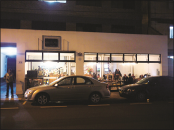 Todavía hay luces rotas, la iluminación no es buena, el tráfico es un caos, pasan muchos autobuses y hay mucho ruido. Entonces, cualquier cosa que quieras hacer tiene que estar, de una forma u otra, conectada a eso. No puedo pretender montar un lugar que sea muy exclusivo, muy limpio, entre comillas; sino que, en cambio, mi negocio tiene que asumir el hecho de que está insertado en esta avenida, que tiene una personalidad muy urbana, que es muy ruidosa. Hemos utilizado perfiles de metal en nuestro local, ventanas antiguas, iluminación con bombillas expuestas. Hemos puesto una pantalla en la ventana para estar conectados con la avenida, que no es una avenida bonita, pero tiene que formar parte de nuestro lugar porque es apropiado (entrevista a Carlos, Santa Cruz, 4 de julio de 2014).