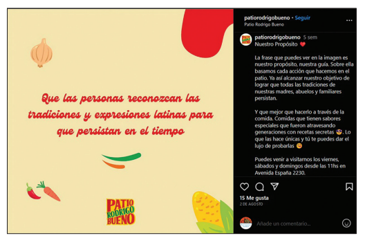 Si bien al poco tiempo de inaugurarlo debió cerrarse debido a la pandemia, su disposición al aire libre permitió que pudiera reabrirse rápidamente cuando se flexibilizaron las restricciones. A partir de entonces, la promoción llevada adelante por el propio GCBA ha crecido, sobre todo a través de redes sociales, en particular de Instagram. Allí, mediante fotografías profesionales y videos que muestran a las cocineras y cocineros en acción, se destaca la propuesta en términos de autenticidad y tradición. En una de sus publicaciones declaran que su propósito principal es el reconocimiento de las “tradiciones y expresiones latinas para que persistan en el tiempo”, vinculando esta idea a las recetas ancestrales “que las hacen únicas” y a las cuales el visitante “tiene el lujo” de acceder (Patio Rodrigo Bueno 2023) (figura 2). A esto se suman notas periodísticas en las que se invitan a los vecinos de la ciudad a conocer este nuevo espacio (Sánchez 2021; Magnani 2023; Observatorio Metropolitano 2022; Yalangozian 2023).