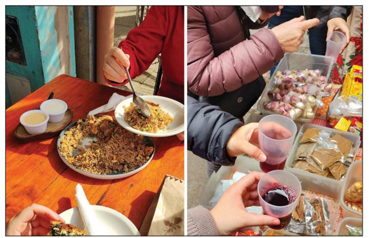 Luego de una capacitación por parte del Gobierno, tres guías comenzaron con el recorrido que incluye entre tres y cinco paradas para degustar bebidas o platos típicos de países latinoamericanos. El recorrido finaliza en la feria, donde se invita a los visitantes a comprar y a volver por su cuenta en otra oportunidad. En este caso las redes (sobre todo Instagram) también son gestionadas a partir del apoyo que reciben del GCBA para el desarrollo del proyecto, junto con la gestión de las reservas o las capacitaciones. El contacto con los vecinos proveedores de los alimentos que se ofrecen a los turistas, en cambio, es agenciado por las guías, quienes buscar ofrecer variedad a los visitantes. Por ejemplo, en el último tour realizado pudimos probar chipa paraguaya, maíz cancha y chicha morada andina, pasteles de queso al estilo boliviano, coxinhas brasileñas y arroz chaufa peruano (diario de campo 2023) (figura 3).