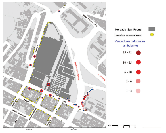 Para comprender el contexto comercial inmediato del mercado San Roque se realizó un levantamiento de datos en el que se observó una aglomeración marcada de personas y ventas en sus alrededores. En la figura 1 se observan los espacios que destacan con mayor aglomeración debido a la cantidad de ventas en la calle: el ingreso principal al mercado San Roque (puerta sur), la cercanía a la Plataforma Central Primero de Mayo (avenida Antonio José de Sucre), la circulación peatonal de la avenida Loja (este-oeste) y las calles transversales posteriores al mercado San Roque (Ambato, Abdón Calderón, Cumandá, Túpac Yupanqui y Cantuña). Se observa además que el comercio de ventas ambulantes tiene mayor presencia que el de locales formales, pues se registra un 60 % de vendedores en las calles frente a un 40 % de vendedores en locales.
