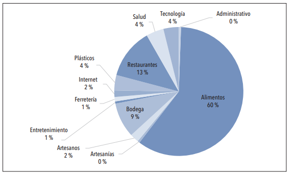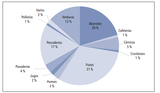 En las figuras 2 y 3 se aprecia la distribución del giro de negocio de los diferentes locales. Se evidencia que la venta de alimentos es preponderante con un 60 % de presencia, existen también otros espacios donde se comercializa tecnología, servicios de salud, restaurantes, plásticos, internet, ferretería, entretenimiento y artesanías. En la venta específica de alimentos se destaca la de frutas, abarrotes, verduras y pescadería, dato importante si se considera que estos productos se venden también en los interiores del mercado.