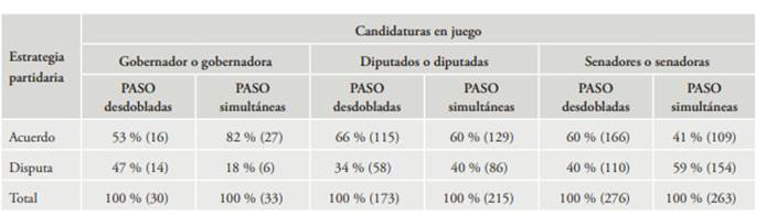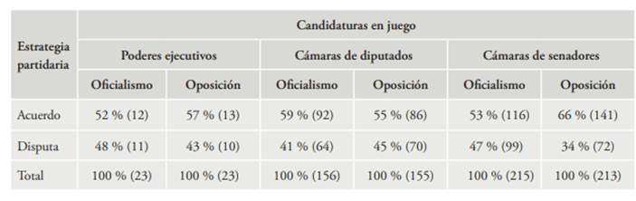En la competencia por la nominación de gobernador o gobernadora el acuerdo de listas únicas fue de un 52 % en el oficialismo y un 57 % en la oposición. Mientras que en la disputa con dos o más listas fue de un 48 % en el oficialismo y de un 43 % en la oposición. En las cámaras de diputados el acuerdo de listas únicas fue de un 59 % en el oficialismo y de un 55 % en la oposición, mientras que la competencia de dos o más listas fue similar en ambos. En comparación con estos niveles de gobierno, el acuerdo de listas únicas en el oficialismo fue del 53 % en las nominaciones por las cámaras de senadores. En la oposición este valor ascendió al 66 %. Por su parte, la disputa entre dos o más listas fue del 47 % en el oficialismo y del 34 % en la oposición.