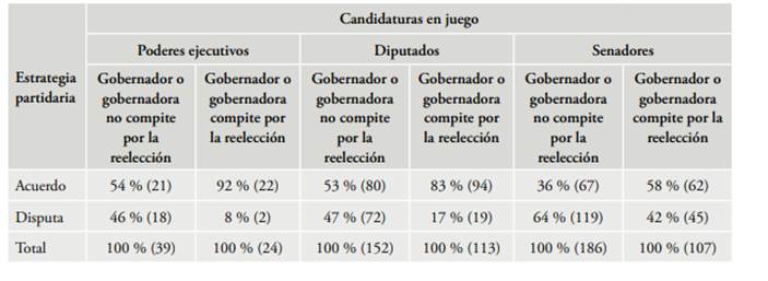 Asimismo, observando las estrategias de acuerdo, cuando el gobernador o gobernadora no compitió por la reelección hubo un 54 % de casos con disputa entre dos o más listas, mientras que cuando el sí buscó la reelección el acuerdo alcanzó el 92 % de las observaciones.