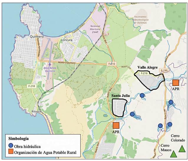 A 10 kilómetros del centro urbano de Quintero se ubica Santa Julia, un caserío de 76 viviendas y 224 habitantes -113 hombres y 111 mujeres- que se desarrolló a partir de la reforma agraria de la década de los 60 en el valle que forman los cerros Mauco, Colorado y Chilcauquén (INE 2019). Unos tres kilómetros al noroeste de Santa Julia se ubica Valle Alegre, con 150 viviendas y una población de 256 personas -133 hombres y 123 mujeres- (INE 2019). Ambas localidades concentran un 16 % de la población rural de Quintero y tienen áreas funcionales muy básicas (INE 2018). Se abastecen de agua potable a través del sistema de agua potable rural (APR), obtenida de acuíferos subterráneos que están atravesados por cursos de agua superficiales de los esteros Mantagua y Quintero, tal como se aprecia en la figura 1 (DGA 2018).