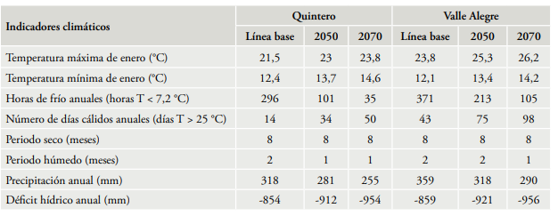 La provincia en la cual se emplaza Quintero ha sido decretada zona de escasez hídrica en el pasado reciente (DGA 2023). La proyección climatológica disponible para la comuna de Quintero y para el Valle Alegre en específico muestra un déficit hídrico anual cada vez más alto y un aumento de 2 ºC de temperatura para el año 2070 (AGRIMED 2017). Se espera que en este mismo periodo se dupliquen los días calurosos anuales, disminuyan drásticamente la cantidad de horas frías y se reduzca la etapa húmeda a la mitad (tabla 1).