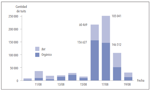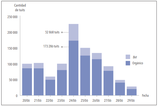 El primer análisis del caso en Twitter/X (figura 1), muestra la automatización de los perfiles que participaron en el debate y los tuits producidos. Se recopilaron