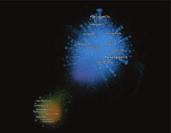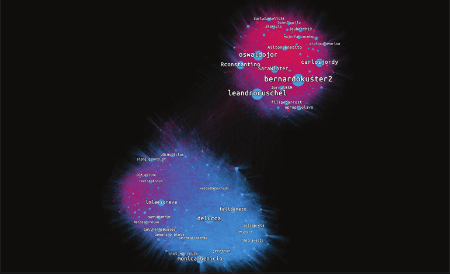 La red de retuits en el caso 2 (figura 5) también estaba muy polarizada en dos clústeres: el pro derechos sexuales y reproductivos (el más grande) tenía más del triple de usuarios que el antiaborto (el más pequeño). Los perfiles (en la imagen representada por los nodos) se agrupan en clústeres según el contenido que retuitean en común. Cuanto más cerca estén dos perfiles en la imagen, significa que más usuarios han retuiteado el contenido de ambos perfiles. De todos los perfiles implicados en la red de retuits, solo el