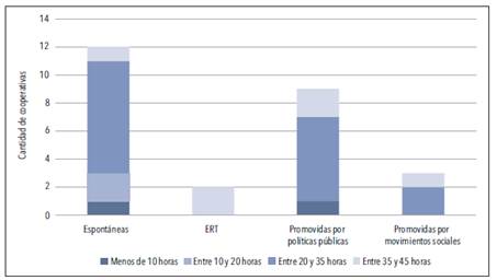 En aquellas cooperativas promovidas por políticas públicas y por movimientos sociales se observa un menor número de personas que trabaja menos de 35 horas semanales y que desean laborar más horas, pero existe un mayor número de asociados y asociadas que buscan otro trabajo fuera de la cooperativa, principalmente debido a ingresos insuficientes. Por otra parte, debemos considerar a quienes tienen otra ocupación además de su puesto en la cooperativa, lo cual ocurre en mayor medida en las de tipo espontánea, en particular en aquellas de profesionales. En este caso, las personas entrevistadas reconocen que las cualificaciones de los miembros permiten su acceso a otras ofertas laborales compatibles con el trabajo en la cooperativa, por ejemplo, la enseñanza o los trabajos en el mismo rubro, pero de manera particular.