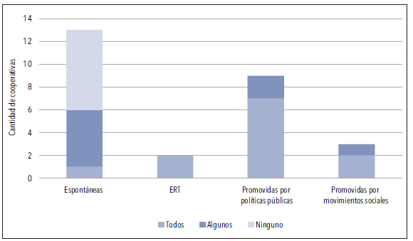 Un primer tipo lo constituyen las empresas recuperadas por sus trabajadores (ERT), las cuales surgen a partir de empresas de propiedad privada que han sido recuperadas por los propios empleados y empleadas luego de un proceso de quiebra. Aquí la condición de trabajador ligada a reivindicaciones sobre la calidad y la seguridad del trabajo suele imponerse sobre su posición como asociado a una cooperativa. En el segundo tipo se encuentran las cooperativas promovidas por políticas públicas, las cuales surgen a raíz de la implementación de una política pública o bien se conforman de manera exclusiva para ser proveedoras del Estado y es este quien impone las condiciones de la relación mercantil. A raíz de ello pueden surgir tensiones en torno a los valores y principios cooperativos, especialmente en todo lo relacionado con la autonomía que adquiere la cooperativa. Sus integrantes son en general sujetos excluidos del mercado laboral y su participación en esta organización cobra sentido a partir de la necesidad de tener trabajo.