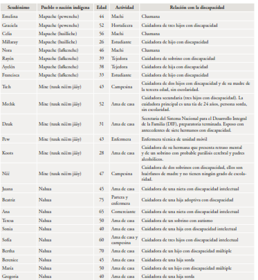 La investigación contó con un total de 24 mujeres participantes pertenecientes a tres comunidades indígenas: seis mujeres mixes, ocho mujeres mapuches y diez mujeres nahuas. Las características de las participantes se detallan en la tabla 1. La selección de la muestra se basó en un muestreo intencional y por conveniencia, buscando mujeres con conocimientos y experiencias significativas en torno a las prácticas de cuidado por sus roles de madres, abuelas, hermanas, tías, parteras y sanadoras tradicionales. El análisis de los datos se realizó mediante un proceso inductivo y comparativo, siguiendo los principios de la codificación abierta y del análisis del contenido de los discursos.