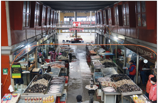 Los mercados municipales se edificaron en los mismos sitios donde, desde la Colonia, los productores e intermediarios de alimentos frescos se instalaban de manera informal. Por ejemplo, en Valparaíso el mercado de la Caleta Portales estuvo originalmente en una zona central cercana al puerto donde desembarcaban los productos artesanales (Camus et al. 2017), algo similar sucedía en Valdivia donde la venta de productos bordemarinos y marinos se realizaba en la actual costanera, donde desembarcaban directamente los botes de los pescadores (Guarda 1965). Más al sur, en el archipiélago de Calbuco, todos los sábados se atestiguaba la confluencia de ambas dinámicas (Saavedra y Navarro 2019). Junto a los mercados municipales se despliegan las ferias libres o la venta callejera, con precios más bajos y con mayor variedad de productos Algo muy similar ocurre en la ciudad de Puerto Montt y en muchos sitios costeros o rurales donde la vida económica se caracteriza por la informalidad y por la apropiación del espacio público (Barriga Parra et al. 2022).