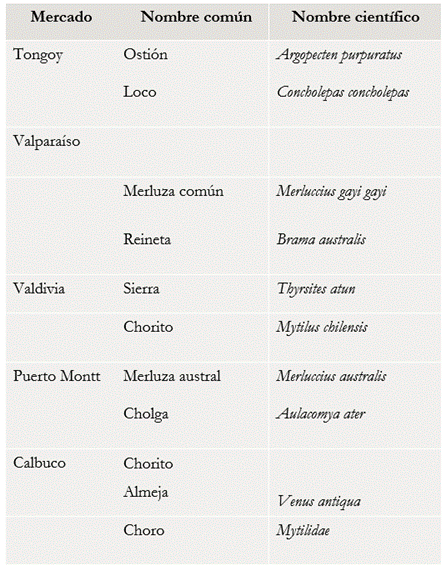 La segunda pregunta indagaba sobre el tipo particular de productos o alimentos típicos de esos mercados y las respuestas aluden especialmente a la pesquería más “conocida” de “la zona” y que suele ser abundante en ese ecosistema marino. En la tabla 3 se presentan los productos que alcanzaron mayores menciones típicas en cada uno de los mercados, además del nombre común y el científico.