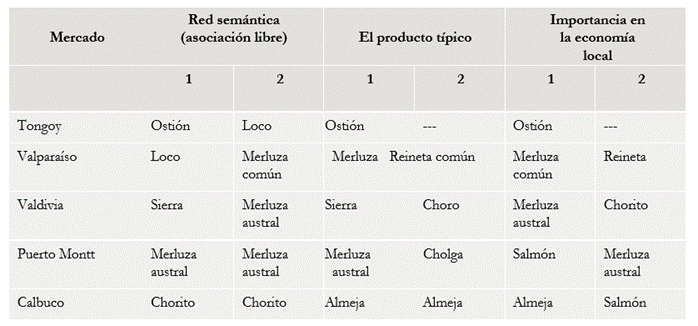 El contraste entre los productos considerados típicos y los mencionados genéricamente puede advertirse a partir del estímulo “productos del mar”, formulado como red semántica natural, sin revelar en estos cinco mercados diferencias entre los productos típicos y los asociados genéricamente al mar.
