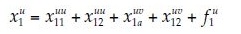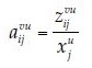 [10]El coeficiente intrarregional aijuu muestra la participación que tiene la demanda del bien i en la región U hecha por el sector j en la región U (zijuu), dentro de la producción del bien j en su misma región (xju). De forma similar, el coeficiente interregional aijvu muestra esta misma proporción pero relacionando los flujos provenientes de los sectores económicos ubicados en las otras regiones (zijvu).