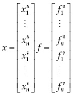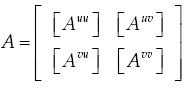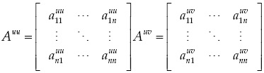 Se puede ver que en los vectores x y f se ordena la información de producción y demanda final para ambas regiones. Finalmente, se define la matriz de coeficientes de la siguiente manera. En la diagonal de la matriz se encuentran unas submatrices de coeficientes intrarregionales para cada región, Auu y Avv. Por fuera de la diagonal se ubican las submatrices de coeficientes interregionales, que en este ejemplo únicamente serán dos: la submatriz que muestra las proporciones de los flujos desde la región U hacia la región V (Auv) y desde la región V hacia la región U (Avu). Todas estas submatrices de la matriz A son cuadradas de tamaño n y contendrán los coeficientes interregionales e intrarregionales respectivos. A continuación se muestra a modo de ejemplo la composición de Auu y Auv: