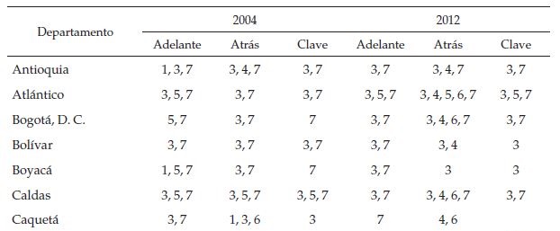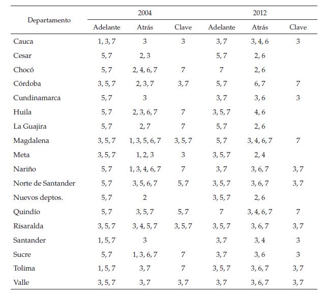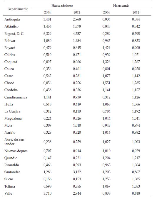 Los indicadores interregionales se calcularon en sus dos versiones, tanto para los encadenamientos hacia adelante como hacia atrás. En la tabla 2 se presenta la posición de cada departamento en el ranking nacional.5
