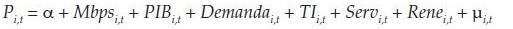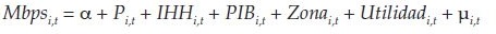 El segundo, un modelo de demanda (Mbps), descrito en la ecuación 3, donde el logaritmo de las cantidades hace las veces de variable dependiente con los siguientes regresandos: