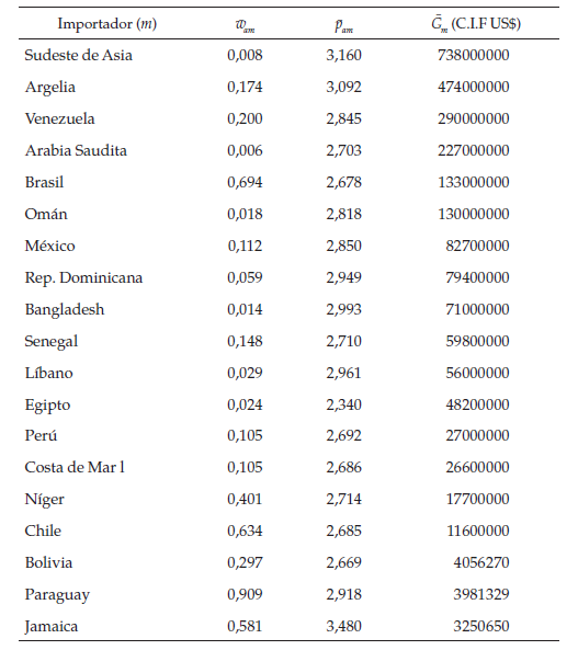 los precios C.I.F. pagados en el mercado m al exportador j de la forma pmj = Gmjt/Qmjt. En cada t, el gasto y la cantidad total de las importaciones del