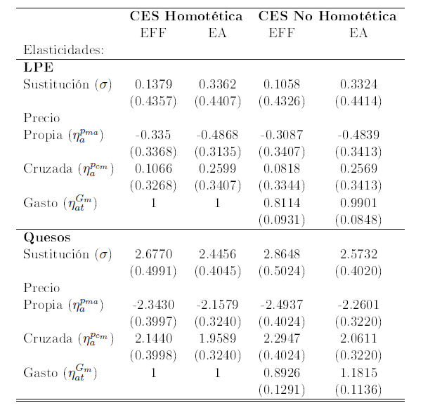 Las elasticidades-gasto son cercanas a la unidad, lo que fue previamente deducido a partir de su coeficiente de demanda cercano a cero; se muestra con ello evidencia a favor del supuesto de homoteticidad de las preferencias. A pesar de ello, si se consideran los estimadores de EFF, puede observarse que ante un incremento en el gasto total en lácteos que realizan los importadores, la cantidad demandada hacia los lácteos argentinos se incrementa pero en una proporción un poco menor (19 % para la LPE y 11 % para quesos). Adicionalmente, se puede ver que las elasticidades-gasto para quesos son mayores que las de LPE, lo que es consistente con el hecho de que los quesos son bienes más de lujo que la LPE y se muestra, incluso, un estimador de la elasticidad mayor que uno bajo el estimador de EA.