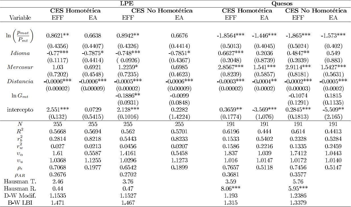 Para el caso de los quesos se observa que, si bien, los coeficientes del precio relativo difieren entre los estimadores de efectos fijos y aleatorios, en ambos casos son estadísticamente significativos. La variable Mercosur es positiva y significativa, donde el estimador de EFF casi que duplica al de EA. Para la variables t-invariantes, la mayor diferencia está en la variable Idioma, siendo solo significativa con el estimador de EFF. La variable Distancia es significativa para ambos estimadores, pero en este caso EA arroja mayores coeficientes. Para la CES no homotética de quesos, el gasto total del país importador muestra no ser estadísticamente significativo, según ambos estimadores. Por lo tanto, para los quesos puede asumirse que bajo el supuesto de utilidad de elasticidad constante (CES) de los importadores, la hipótesis de homoteticidad no se rechaza en términos estadísticos.