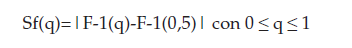 (9)En este caso, S mide la extensión o spread de un rango de ingreso asociado con Q; es decir, no importa cuál rango de clase media alrededor de p=0,5 es elegido, el spread de ingreso normalizado requerido para capturar este rango es más grande (o no más pequeño) para la distribución G que para la distribución F. En este sentido, G tiene una mayor bipolización de ingreso que F.