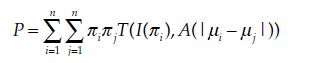 (1)donde (Πi) es una función creciente de la proporción de individuos dentro de un determinado grupo, A representa la alienación calculada en función de la distancia absoluta de los ingresos entre grupos, y T(I,A) representa una función de antagonismo efectivo. Por lo tanto, la polarización total P se calcula como el promedio ponderado de cada uno de los antagonismos efectivos. Los autores determinan que el índice de polarización que respeta un conjunto deseable de axiomas (véase Esteban y Ray, 1994) debe ser proporcional a: