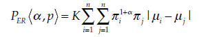 (3)El primer término de la ecuación (3) corresponde al índice PER, mientas que el segundo término representa una medición del error o falta de identificación, ponderado por un parámetro libre β. El error se mide como la diferencia entre el coeficiente de Gini al tomar toda la distribución G(f) y el Gini que resulta de separar la población en n grupos; es decir: