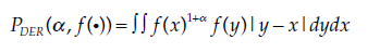 (5)Según Duclos et al. (2004), los índices ER y EGR poseen problemas de discontinuidad en la captura del nivel de polarización y discrecionalidad en la determinación de grupos relevantes. Por ello, los autores proponen un nuevo índice denominado DER, que constituye una extensión al índice de polarización ER. Este nuevo índice está basado en la aproximación de la fuerza de identificación de grupo para cada individuo. Para su cálculo se utilizan técnicas no paramétricas de kernels, mediante el valor de la función de densidad evaluada en el ingreso del individuo, tal que: