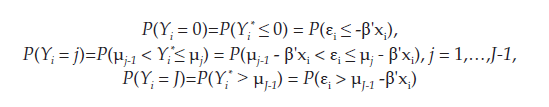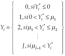 (1)donde Y* es una variable no observable; Y es la forma de asociación del micronegocio; X es una matriz de variables explicativas que pueden ser tanto continuas como discretas; β es el vector de coeficientes y ɛi es un término de perturbación aleatoria. Por lo tanto, la elección del microempresario entre las alternativas 0,…,J es reflejo del valor de Yi* en relación con los umbrales μj, j = 1,…,J, es decir: