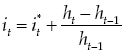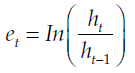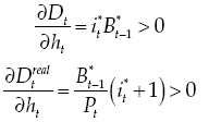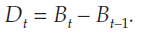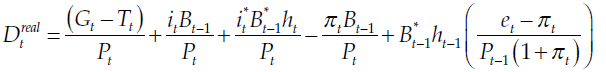 (5)donde Dt denota el déficit nominal para un período, Gt corresponde a los gastos sin intereses del gobierno central, Tt son los ingresos totales del gobierno central, it e it* son las tasas de interés de la deuda pública interna y externa, respectivamente, Bt–1 y Bt*–1 son los saldos de la deuda pública interna y externa en el período anterior, respectivamente, y ht es el tipo de cambio nominal. Se define la tasa de depreciación del tipo de cambio como: