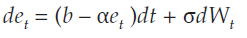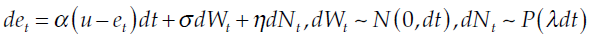 (9)donde el tipo de cambio, et oscila alrededor de su valor promedio de largo plazo u, la velocidad de ajuste cuando et es mayor o menor al promedio u es denotada por α, Wt se refiere a un movimiento browniano estándar, Nt es un proceso de Poisson homogéneo, λ representa la intensidad (número de saltos por unidad de tiempo) del proceso Poisson y η corresponde al tamaño medio esperado del salto.