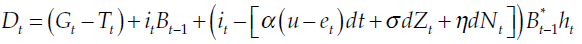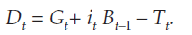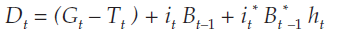 El déficit fiscal, Dt, resulta de la suma entre gastos sin intereses del gobierno, Gt, que incluye gastos de funcionamiento e inversión más el pago de intereses, itBt-1, donde it es la tasa de interés nominal de la deuda pública multiplicada por el saldo de la deuda en el período anterior, Bt-1, menos los ingresos totales del gobierno, Tt, como se muestra en la siguiente ecuación.