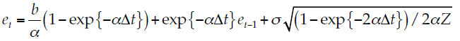 (15)La siguiente ecuación resulta de la discretización de la ecuación que representa el proceso de reversión a la media (12). Para esta representación se considera una partición 0 = t0 < t1 < t2 < ∙∙∙ < tn con tamaño del paso constante dado por Δt = ti — ti-1, como en Phillips (1972):