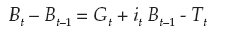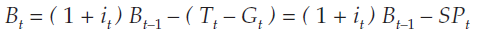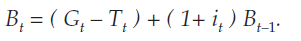 En consecuencia, la deuda del gobierno en el período actual está compuesta por el déficit primario más el saldo de la deuda en el período anterior más sus respectivos intereses, como se muestra en la siguiente identidad: