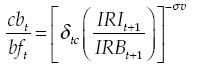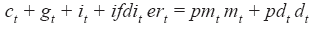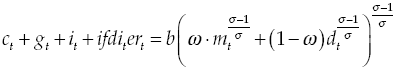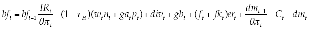 (E1)Where c,n,dm are, respectively, consumption, labor and holding of real balances per unit of effective labor; γc is the relative risk aversion parameter in the consumption;7 1/γn is the elasticity of intertemporal substitution of leisure;8 1⁄γm is the elasticity of intertemporal substitution of real balances,9 β is discount factor; ψn, ψm are weighting factors of utility function; bf ,ga ,f,div ,gb are financial savings, profits of firms, remittances, dividends from investment companies and banking profits, respectively, in real terms and per unit of effective labor;10τH is direct tax rate; IR is gross nominal interest rate earned by household for its financial saving, w=W⁄P,er=ER/P are nominal salary, nominal exchange rate, deflated by price of the consumption, πt+1 = Pt+1/Pt is inflation and Ɵ is gross rate of population growth: