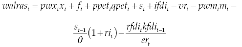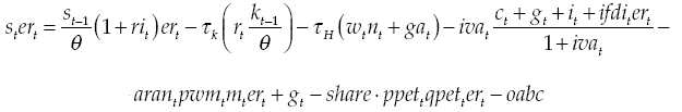 The government receives income from oil exports,6 determines the direct and indirect tax rates and defines an exogenous spending plan. Its fiscal result is endogenously determined and must be consistent in the long term with the level of sustainable indebtedness, which is assumed to correspond to the debt level observed in the steady state equilibrium. Any mismatch taking place because of exogenous shocks the economy experiences must be corrected in the long term through fiscal policy, either by increasing taxes, or through future contraction of public spending.