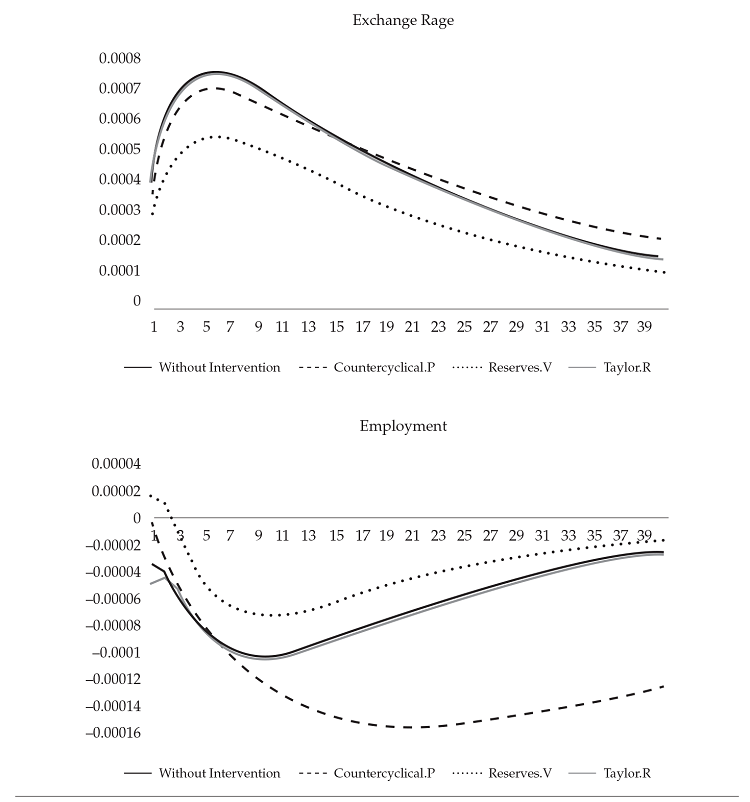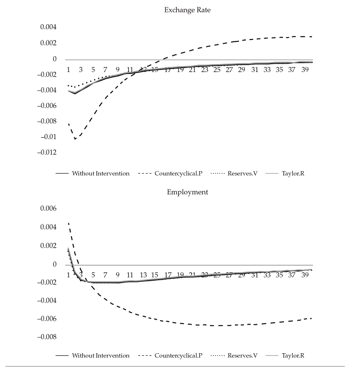 The exchange rate policy, on the other hand, can generate positive effects through decumulation of reserves. It may even reverse the output drop and the inflation increase. Of course, decumulation of reserves involves vulnerability risks that are difficult to analyze in models such as ours as we assume rational expectations. Nevertheless, the suggestion is clear: in order to face non-permanent shocks in foreign exchange markets, the first option is the exchange rate policy, through accumulation or decumulation of reserves.