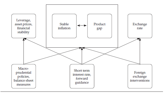 In conclusion, the link between inflation stability and product is not clear, and new objectives must be considered: asset prices, agents leverage, financial stability and exchange rate. According to this, new instruments are also needed: massive interventions in credit markets, macro-prudential policies to mitigate systemic risks, forward guidance to influence the future interest rate, interventions in the foreign exchange market and control over capital flows. Extending the scheme proposed by Blanchard et al. (2012), it could be affirmed that if the simple scheme in Figure 1 could be enough to represent the monetary policy before the great recession, now a more complete scheme, such as the one shown in Figure 2, would be necessary.