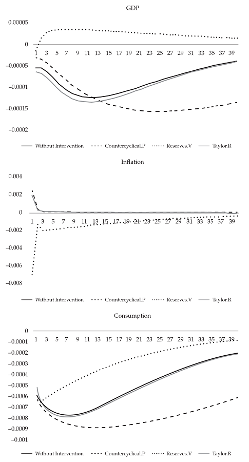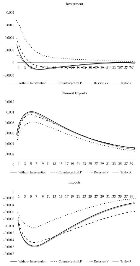 In each simulation, four economic policy scenarios are evaluated: the basic scenario, in which no intervention is given by fiscal or monetary authorities; a second scenario in which an anti-cyclical fiscal policy is applied by increasing public expenditure in response to negative shocks; a third scenario that uses the Taylor rule formed by monetary authorities; and, finally, a fourth analysis that applies certain exchange rate measures in response to shocks. The results of the negative productivity shock are presented in the following graphic: