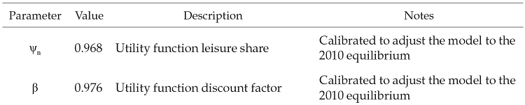 The model is calibrated with information of 2010 which is a representative year of the behavior of the Colombian economy and we assume it replicates Colombia´s steady state. During this year, the gdp grew at a yearly rate of 4 %, and inflation was 3.17 %. Additionally, the central bank intervention rate started the year at 3.5 % and finished it at 3 %. Data used are annualized and come primarily from the National Accounts, Balance Payments and the series of monetary aggregates of the Banco de la Republica (Colombia´s central bank). The elasticities of functions used in the model are summarized in Table 1.