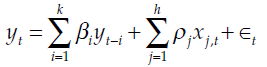 In the case of time-series econometric models, a commonly used model is the linear autoregressive exogenous model (ARX). In this model [1], the output variable (yt) is modeled as a linear function of k lagged yt variables and h exogenous variables (xt). Solving this linear closed-form problem consists of minimizing the sum of square differences between observed and estimated output variables, yt and t , respectively.