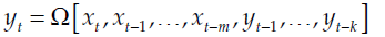 Based on Lin et al. (1996), let Ω represent a non-linear function, and k and m the output and inputs lag order, respectively, a Non-linear AutoRegressive eXogenous (NARX) model may be represented as in [2]. In this case, the output variable (yt) is modeled as a non-linear function Ω of k lagged yt variables and m lagged exogenous variables (xt).