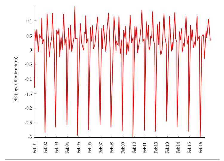 We employ two standard measures of out-of-sample (i. e., on the test dataset) performance. First, the root mean square error (RMSE) between the observed and the predicted logarithmic returns of ise. Second, the correlation (r̅ ) between the observed and the predicted logarithmic returns of ISE.