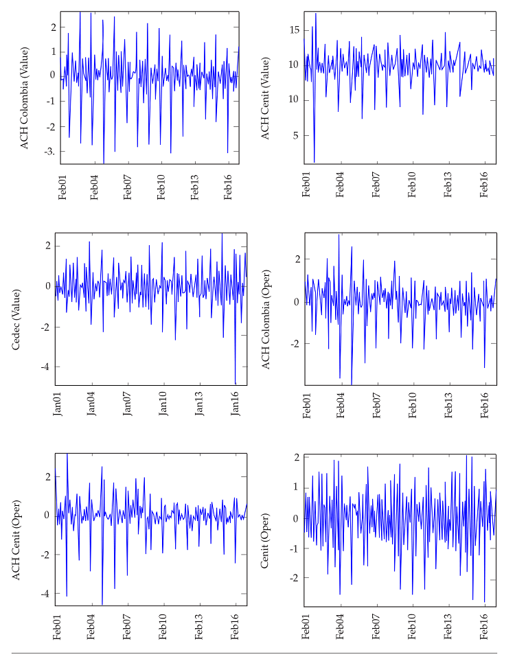Figure 2 exhibits the six inputs from January 2001 to December 2016. Inputs are non-seasonally adjusted; those corresponding to values are at constant prices —deflated by the consumer price index—. Descriptive statistics and visual inspection (Table 6 and Figure 7, in the Appendix) reveal that all series are to be considered non-normally distributed (except the number of operations of Cedec) and potentially heteroscedastic. As in Galbraith and Tkacz (2017), inputs are monthly aggregates of daily transactions, and they are available simultaneously; issues related to mixed-frequency or asynchronous data are absent.