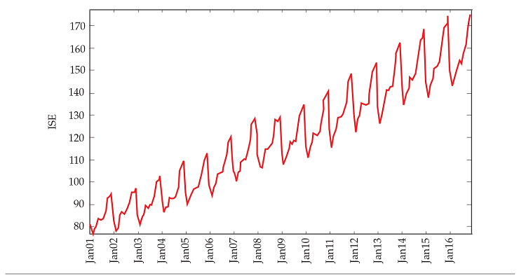 Figure 1 exhibits ise from January 2001 to December 2016; descriptive statistics and the logarithmic returns of ISE are reported in Table 6 and Figure 6 (in the Appendix). As electronic payments data is non-seasonally adjusted (i. e., seasonal patterns are not removed), we use the non-seasonally adjusted ISE, at constant prices. We work with the revised index instead of preliminary estimates; as highlighted by Bell et al. (2014), ultimately, it is the official data that is most important for policy makers.