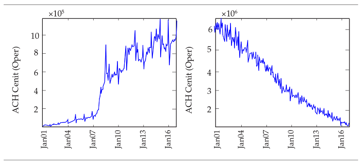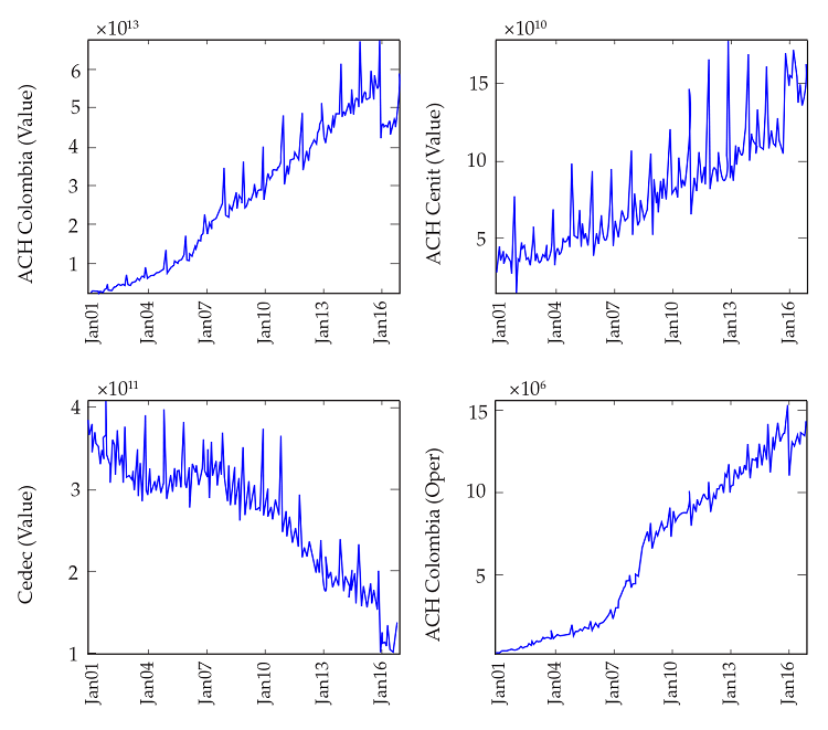 In our case we use a dataset comprising the value and number of operations from two different electronic payment instruments. First, from electronic transfers ordered by individuals, firms, and the central government, which are processed and cleared in both existing automated clearing houses (ACH), namely ACH Colombia and ACH Cenit; second, from cheques that are processed and cleared in the local cheque clearing house, Cedec. Unlike Galbraith and Tkacz (2017), we do not consider debit and credit card transactions because their contribution to the total value of electronic payments is rather low (i. e., below 5 percent), and because data is available with a lag that is incompatible with a nowcasting task, i.e. two or three months. Also, we do not limit cheques to being ‘small’. A notable shortcoming common to both works is the absence of information about cash payments —the prevalent payment instrument in Colombia—.3