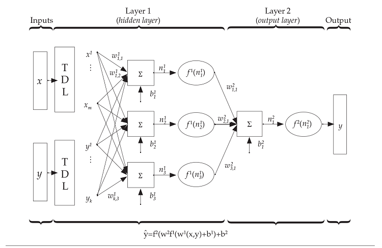 The first (hidden) layer consists of two tapped delayed lines (TDL) that contain the vectors of lagged inputs; three bias scalar terms (b11, b12, b13) with a constant input of 1; all w1 weights that connect each input with the three neurons (i. e., the sum operators and their corresponding activation functions, f1). The second layer consists of a single neuron with an operator that sums the product of the weights (w21,1,w22,1,w23,1) and the result from the neurons in the first layer (f1 (n11) , f1 (n12) , f1 (n13)); one bias scalar term, b21, with a constant input of 1; and the second activation function (f2 (n21)), which yields the output.