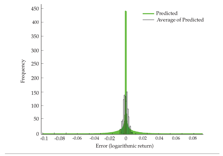 Figure 5 exhibits the density forecast (i. e., distribution of errors) corresponding to the 30-neuron scenario. It compares the out-of-sample errors attained by each one of the 1,000 predictions to those attained by the committee (i. e., the average prediction). As expected, the committee’s prediction exhibits a manifestly lower dispersion of errors: The errors’ range decreases from [-.1006, .0930] to [-.0069, .0070], with negligible variation in the mean error.