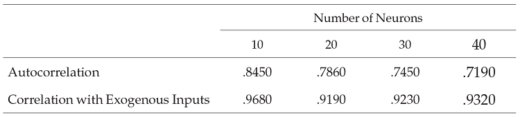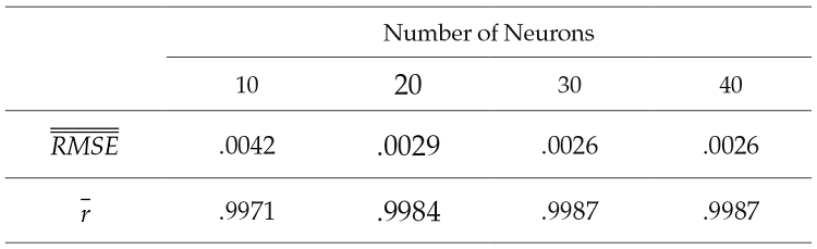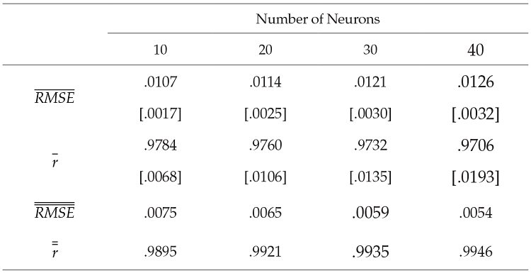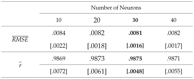 and r̅. Standard deviation for both measures are reported in brackets. In the four scenarios considered, both measures of average out-of-sample performance appear to be fair. The measures do not change noticeably with variations in the number of neurons. The scenario that results in the lowest coefficient of variation (i. e., dispersion relative to the mean) is the one with 30 neurons.